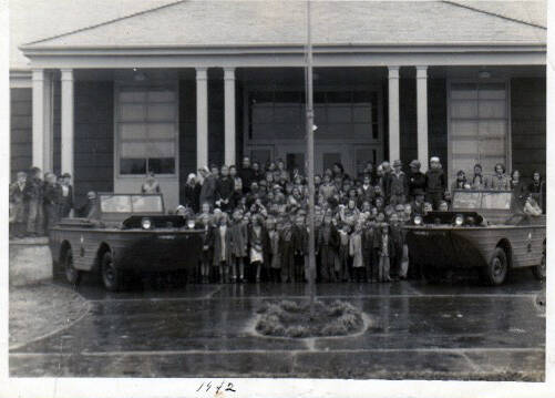 This photo was taken in 1942 outside the School’s Annex building. At the time the building may have served grade school children. The reason for and who is in the photo has been lost to time.