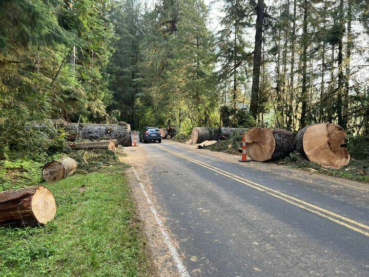 This scene greeted visitors to the Hoh Rain Forest on Monday morning, August 26. Photographer and frequent visitor to the Hoh, Terry Breedlove, captured the moment. Breedlove said that upon further inspection the old spruce had rot near the base and …fell. Luckily nobody was driving by at the time!
