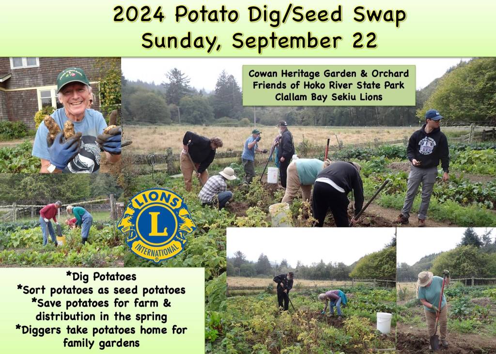 Thirteen folks from Forks and Clallam Bay Sekiu enjoyed a sunny afternoon at the Cowan Heritage Area kitchen garden, at the Annual Potato Dig/Seed Swap. After a potato-digging orientation, eager diggers went to work, carefully excavating potatoes. The potatoes were then sorted. Most were Ozette potatoes. Many were saved for farm seed potatoes to plant next spring. Several diggers took home seed potatoes for their own home gardens. It was a fun and productive afternoon. Submitted photos