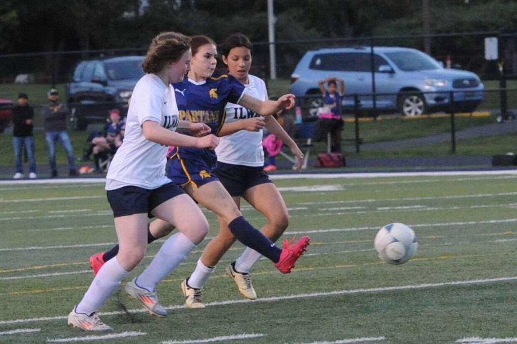 Spartan Molly Hampton controls the ball between Ilwaco players at Spartan Stadium where Forks defeated the Fishermen 4 to 0. Photo by Lonnie Archibald