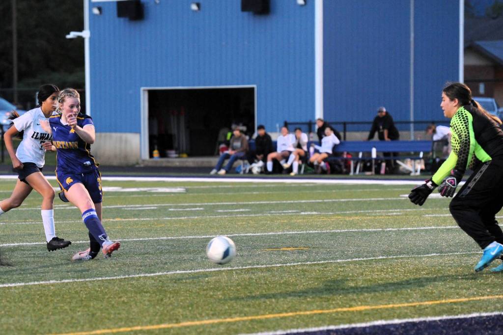 Spartan Miley Blanton kicks past the Ilwaco goalie for one of her three goals as Forks defeated the Fishermen 4 to 0 at Spartan Stadium. Photo by Lonnie Archibald