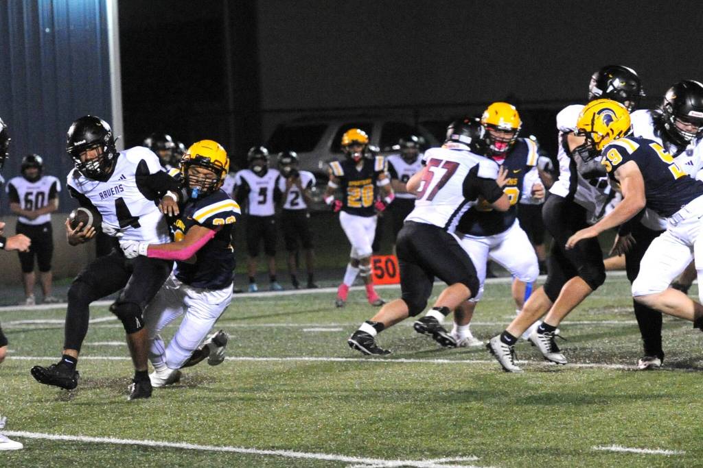 Forks’ Kaden Ward sacks Ravens quarterback Chris Quintana at Spartan Stadium where a stinger Forks defense played a big role in defeating Raymond-South Bend 35 to 8. Story page 6. Photo by Lonnie Archibald