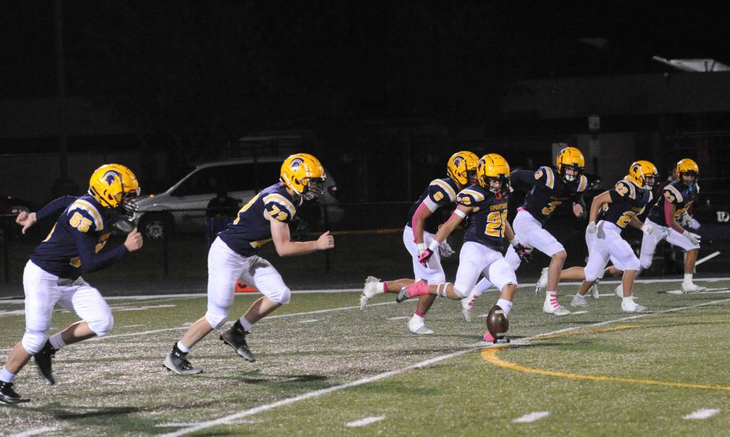 Spartan kicker, DeAnthony Davila kicks off against the Ravens in this contest won by Forks 35 to 8 on the turf of Spartan Stadium. Davila was superb in his kickoffs and the kicking of extra points this season. Also on the kick-off from left are Landon Thomas, Jeremy Hutto, Kade Highfield, Gage Willenbrink, Jai Leavitt-Ward, and Kaden Ward. Photo by Lonnie Archibald