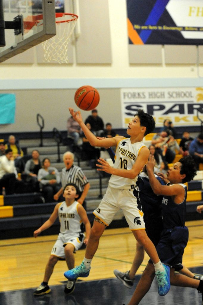 Spartan Shawn Smith (45) drives toward the basket while teammate Wyatt Johnson sets a screen. Also in the action is Ryder Romberg (12) in this 7th-grade game won by Chicacum. Photo by Lonnie Archibald