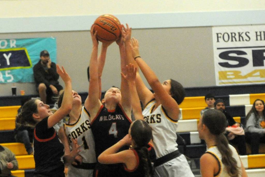 Spartans Bailey Johnson (1) and Pearl Salazar (5) compete with the Wildcats for ball control Saturday afternoon in the Spartan Gym where Forks defeated Crosspoint Christian 59 to 47.