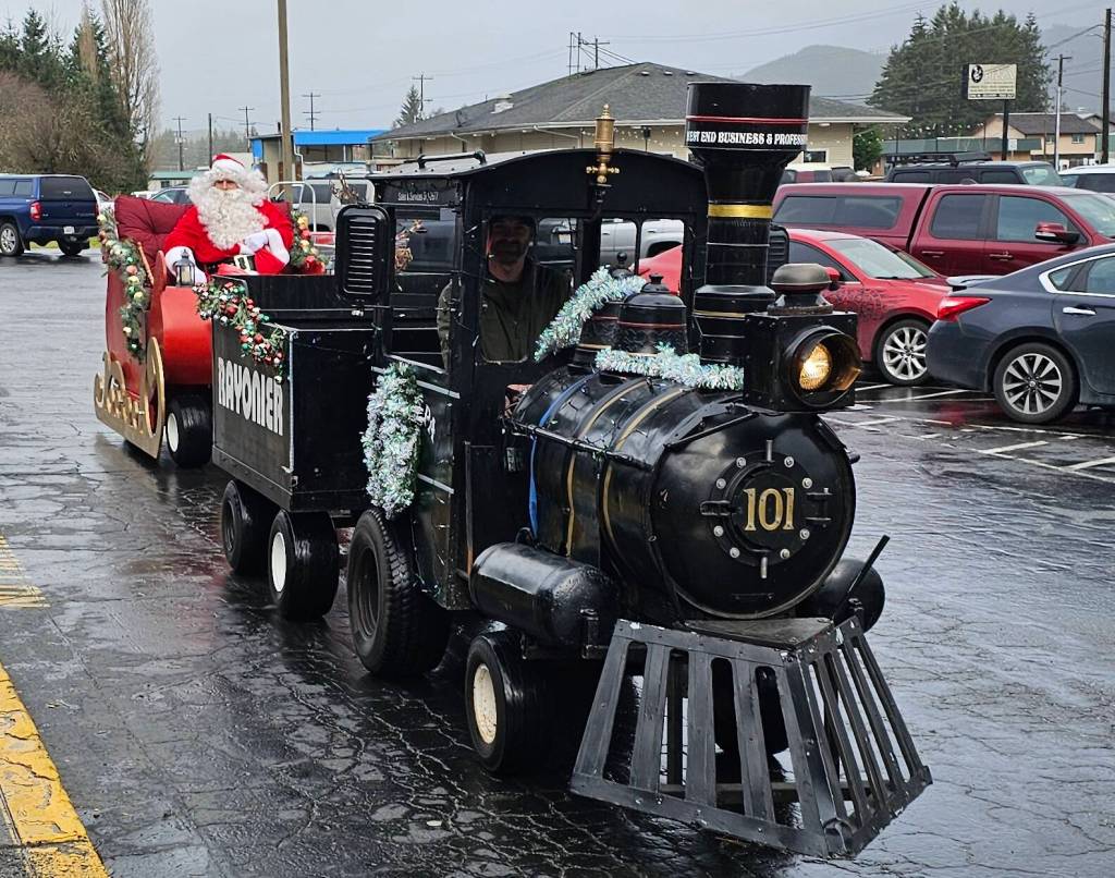 Santa arrived outside Forks Outfitters on Saturday to do the honors at the WEBPA Drawing. Afterward he listened to a few Christmas wishes and handed out a few candycanes. Max Buckner is the creator of the new sleigh and on Saturday Trent Thurman was serving as the train engineer. Photo Robyn Wright