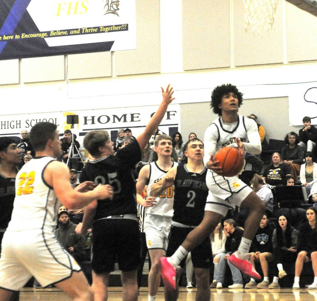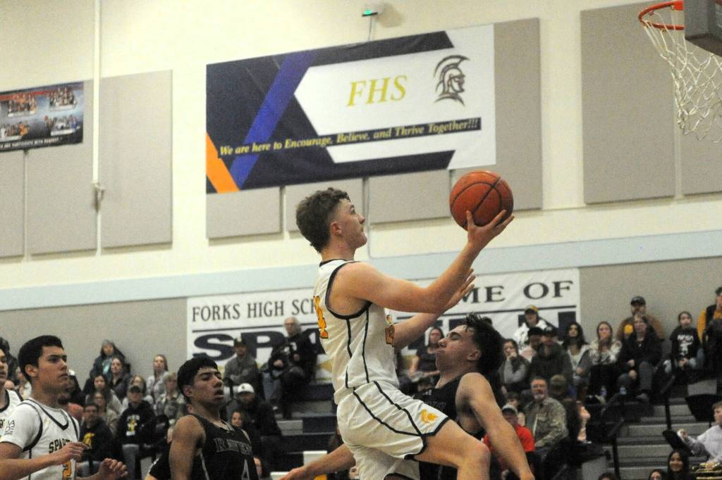 Forks’ Landen Olson drives and scores against Raven defenders January 7 in Forks were the Spartans defeated Raymond-South Bend 67 to 45 in a hard fought contest in which most of the game was much closer than the final score. Trailing the play is Spartan Noah Foster.