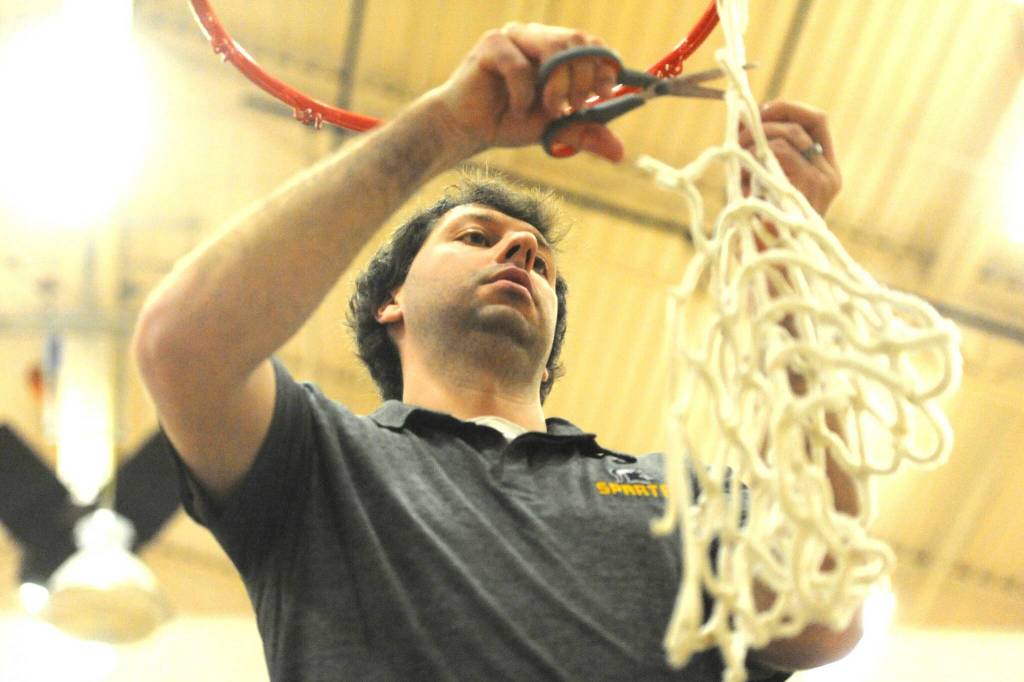 Spartan head coach Keith Weekes cut down the remainder of the net after the varsity boys had each taken a strand. The Forks boys won the Pac 2B league with a win over North Beach at home on Senior night.