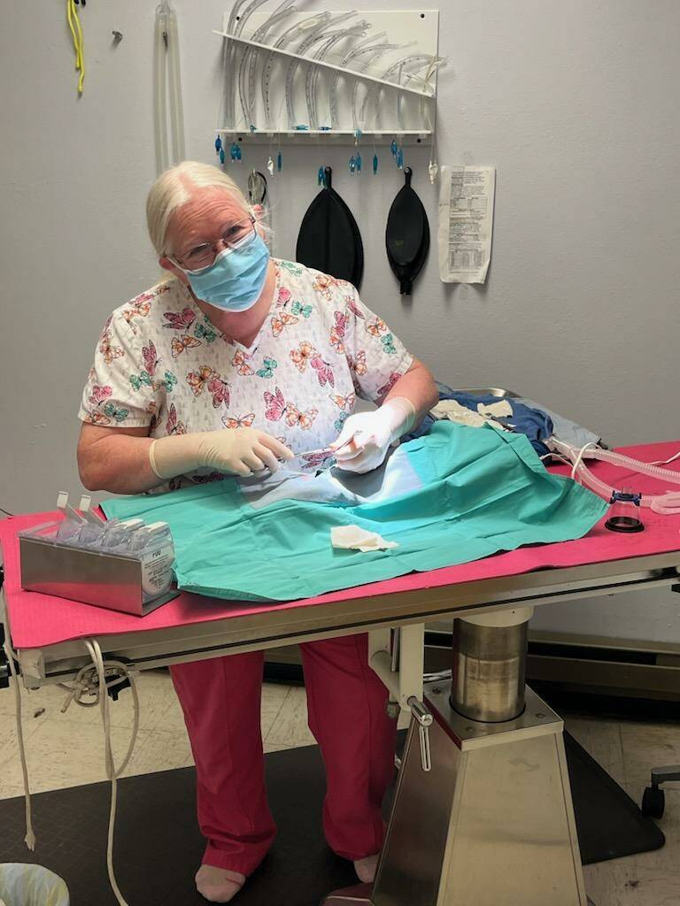 Friends of Forks Animals sponsored a Free Spay/Neuter Clinic on Thursday, Feb. 27, at Dr. Pat’s Pet Care in Forks. Thanks to a generous grant from the Lloyd Allen Charitable Trust, 18 female cats were spayed and seven male cats were neutered, helping reduce pet overpopulation in the community. Here Dr. Pat works on one of her patients.