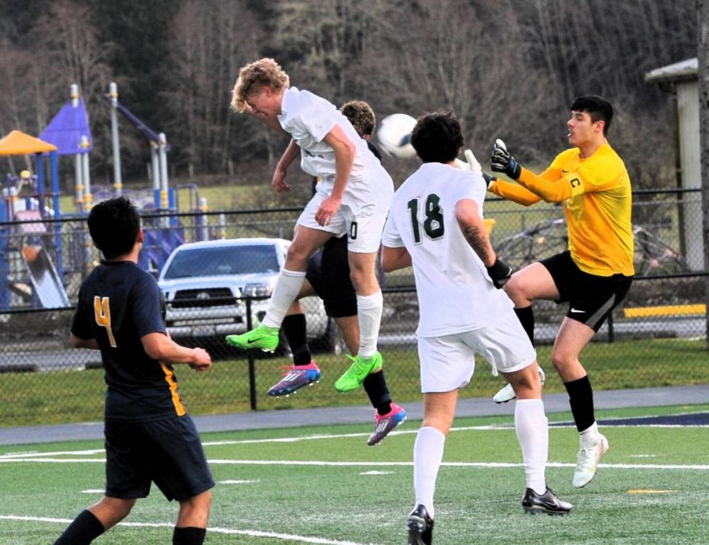 Spartans from left, Eduardo Calmo, DeAnthony Davila (partially hidden), and goalkeeper Juan Terrones protect the goal against the Roughriders during the first half of play. After the Roughriders scored two goals in the first half the Spartans shut out class 2A Port Angeles in the second half.