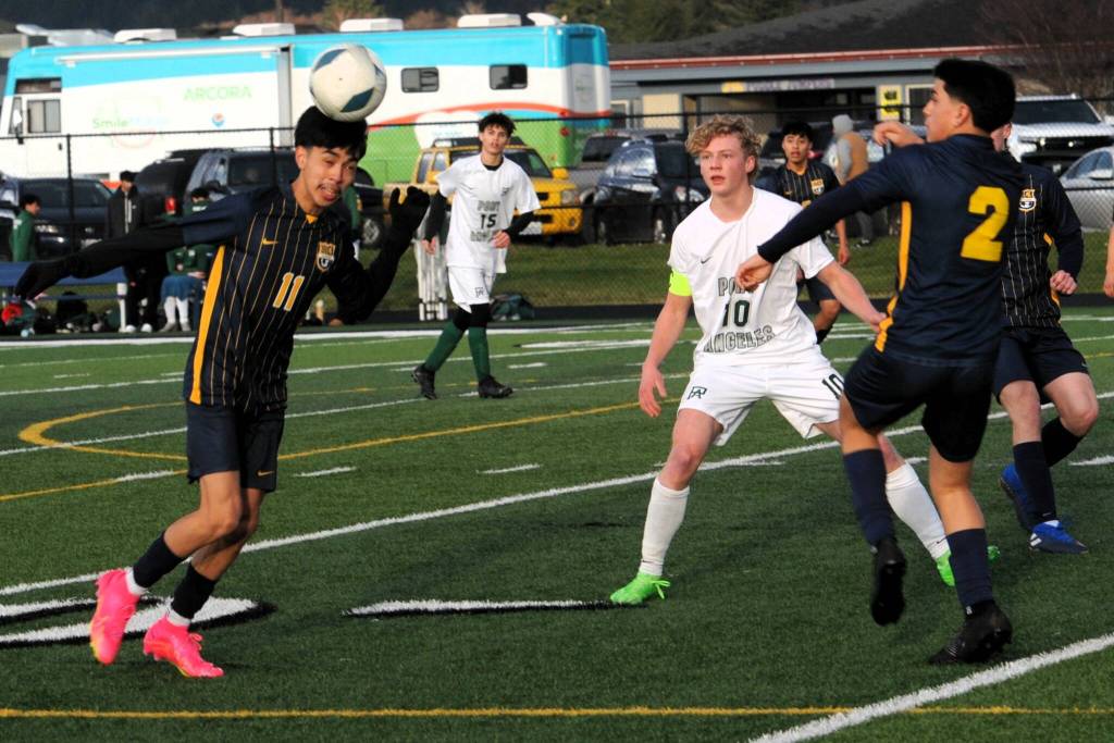 Forks’ Eduardo Calmo kicks away from Roughriders Matthew Miller and Sebastian Bautista on the Spartan Stadium turf on Thursday, March 13. The next scheduled game for Forks is Thursday, March 20 at 6 p.m.
