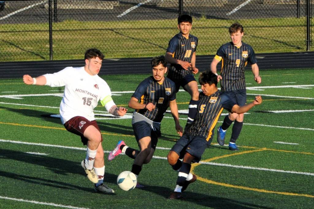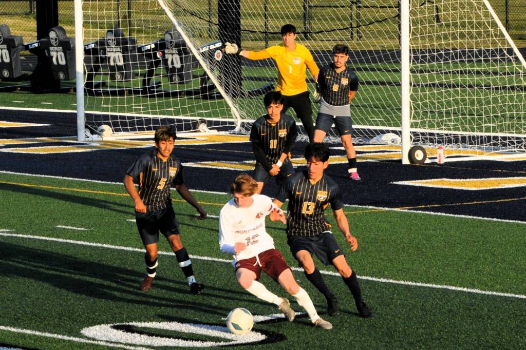 Spartans DeAnthony Davila (8), Orlando Camacho (5), Abraham Montealegre (10), and Brody Owen (9) on the defense against the Bulldogs, whom Forks defeated on the turf of Spartan Stadium on April 15.