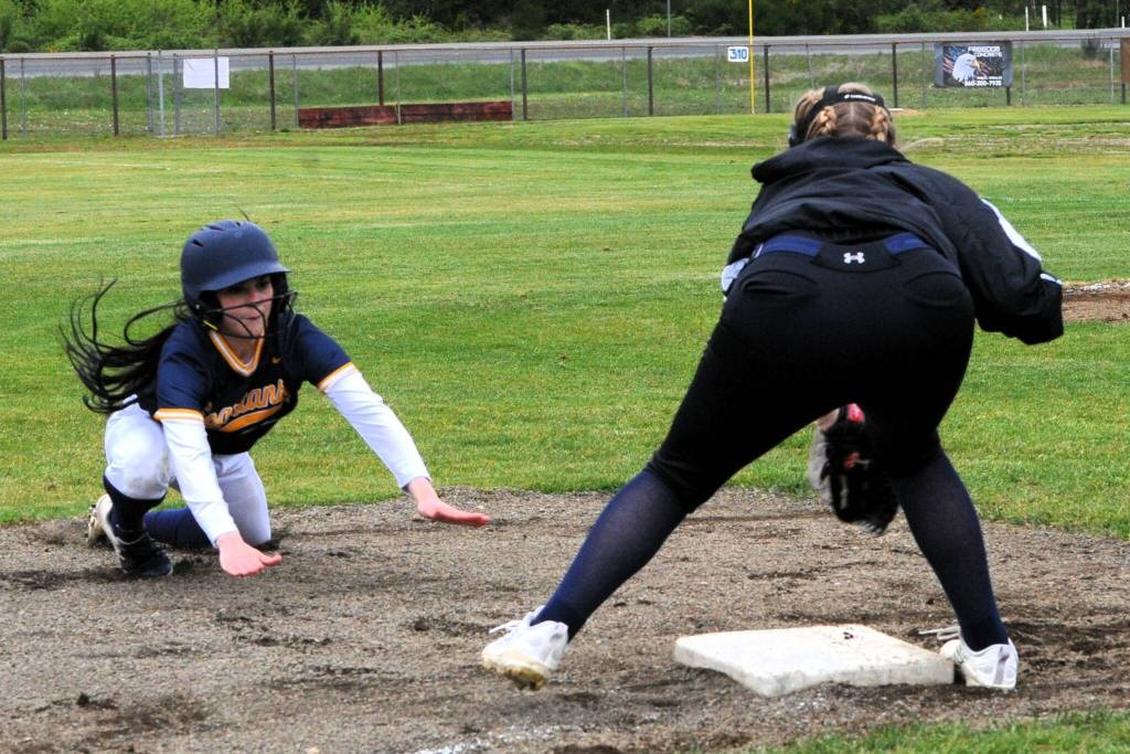 Spartan Lilian Jacobson steals third in the second game in which hits and runs were many for Forks.