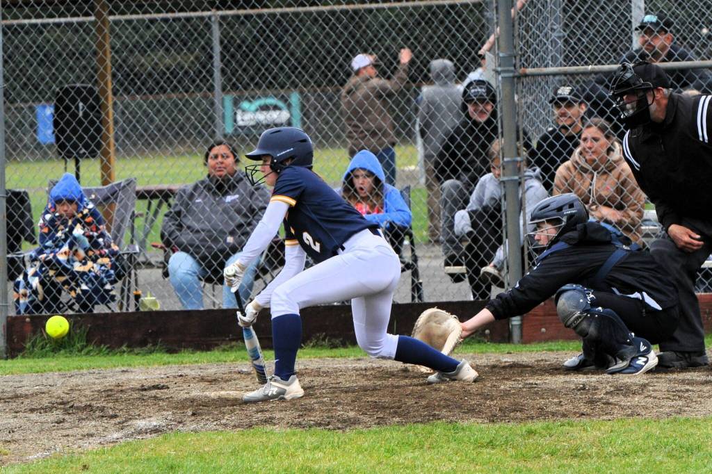 Forks’ Bailey Johnson with a base hit against Ilwaco. Johnson hit two home runs in the first game going 2 for 4 and 3 for 4 hits in the second game with one being a triple.