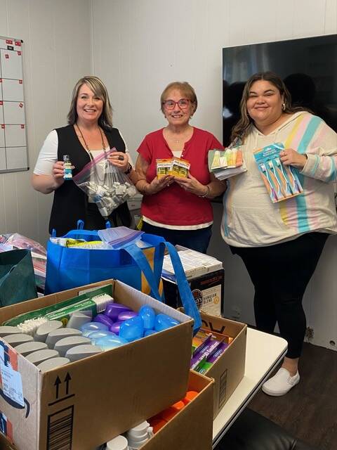 Soroptimist International of the Olympic Rain Forest recently delivered hygiene supplies to the Hope Center and Mariposa House. Pictured here with boxes of supplies are the Hope Center case managers: Jessica Mishler, Christine Lee and Kevin Moody.