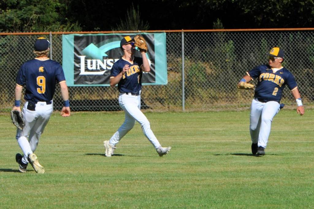 Spartan Kingston Steffen came a long way from center field to make this catch of a fly ball between teammates Landen Olson (9) and Cordel Horejsi.