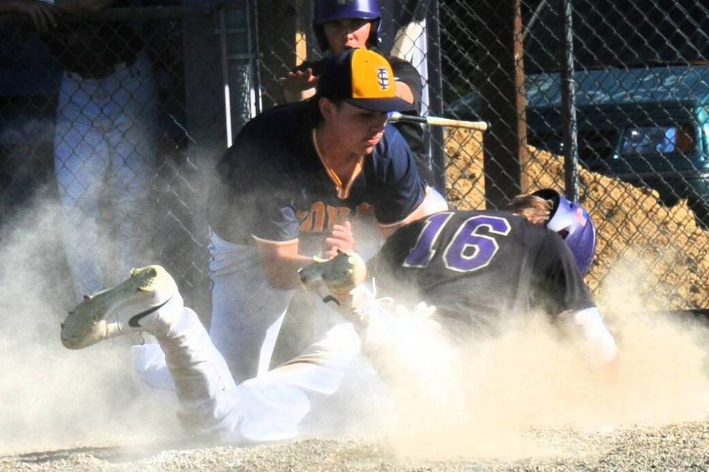 Forks pitcher Conner Clark tags the Sequim runner safe in a cloud of dust at home plate Thursday at Fred Orr Memorial Park in Beaver.