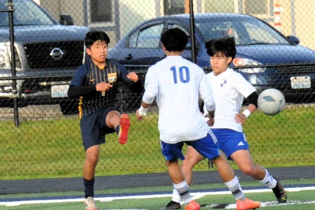 Forks’ Eduardo Calmo, who later scored the second goal for Forks, kicks between two Eagle defenders.