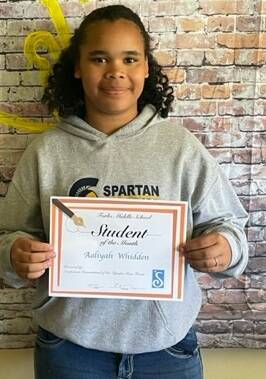 Aaliyah Whidden was named April’s 6th Grade Student of the Month. She loves the color purple, dumplings, giraffes, and math. A Roblox fan, Aaliyah, hopes to earn straight A’s next year. Her teachers praise her as a natural leader, talented writer, and supportive peer with a great sense of humor. Whether helping classmates or lighting up a room with her energy, Aaliyah stands out. She thanks her meemaw, mom, uncle, aunt, and papa. Great job, Aaliyah!