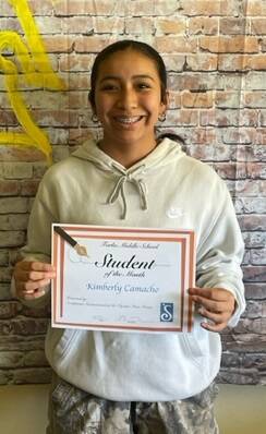 Kim Camacho is April’s 8th Grade Student of the Month. She enjoys ELA, wrestling, Mexican food, and the color black. Known for her dedication, leadership, and positivity, Kim is a role model in both academics and athletics. Teachers praise her drive, maturity, and kindness, noting her lasting impact at FMS. As she heads to high school, Kim aims for strong grades and new learning. She thanks her parents, Madison, and Lorrie. Congrats, Kim—you’ll be missed!