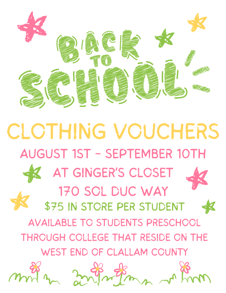 Ginger’s Closet in Forks is helping local students gear up for the school year with $75 clothing vouchers, available now through September 10. The program is open to students from preschool through college who live on the West End of Clallam County.