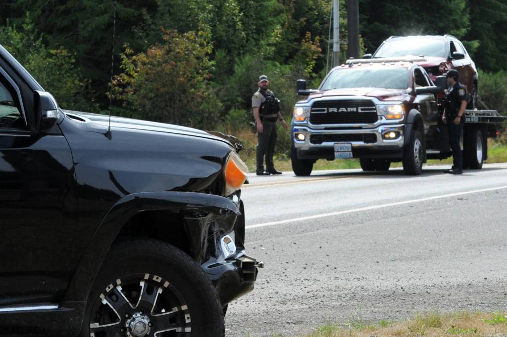 One vehicle involved in the two-vehicle accident sits along the westbound lane of Highway 110 with damage to the front passenger side while another vehicle was hauled away by a wrecker service. At the scene were the Clallam County Sheriff, Forks Police, LaPush Police, Forks Hospital EMT, and the Forks Fire Department. This area also saw another two-car accident on Tuesday. The Forks City Council has been discussing a speed reduction in this area. Photo by Lonnie Archibald