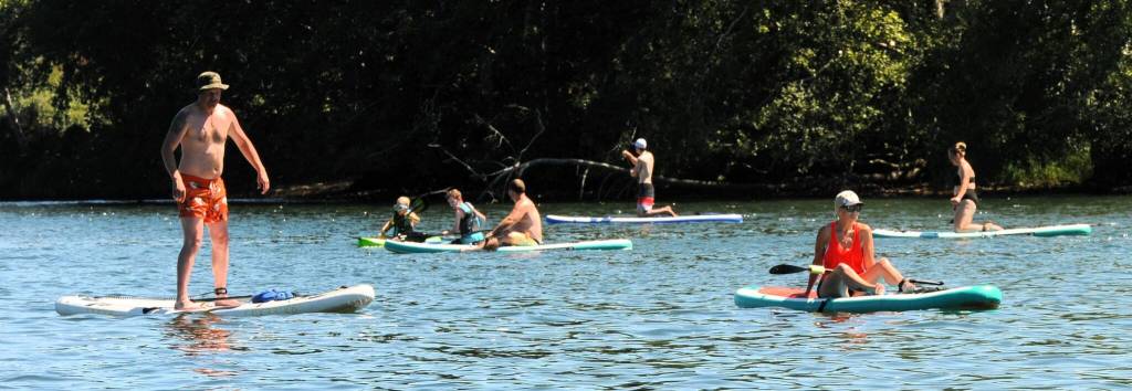 These pleasant Paddleboarders were many on Sunday afternoon at the Lake Pleasant County Park where many took to the lake to escape the heat. Paddleboarding and kayaking are both growing sports. Swimmers, boaters, tubers and picnickers were also out for a pleasant day. A pleasant day that is at Pleasant. Photo by Lonnie Archibald