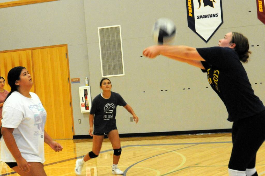 Spartan junior returner Fynlie Peters hits during practice. Chloe Gaydeski will be the only returning Forks senior playing volleyball this season. Photo by Lonnie Archibald
