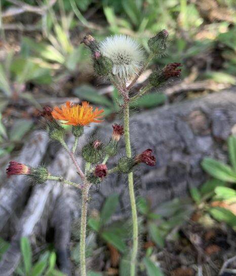 Another species we would like to bring to the stage: orange hawkweed. This aggressive perennial is rapidly invading pastures, meadows, and rangelands across Washington. It poses a serious threat to our grazing ecosystems, since it is inedible to livestock and difficult to control. Growing through robust root system, underground rhizomes and above the ground runners known as stolons. The plant has brighter orange flowers, clustered in groups of 3 to 7 make it easy to distinguish from other hawkweed species. The base of orange hawkweed grows in a basal rosette with oval leaves that taper at the stem. When it goes to seed it produces fluffy white bristles that are swept away in the wild and dispersed into new territories.