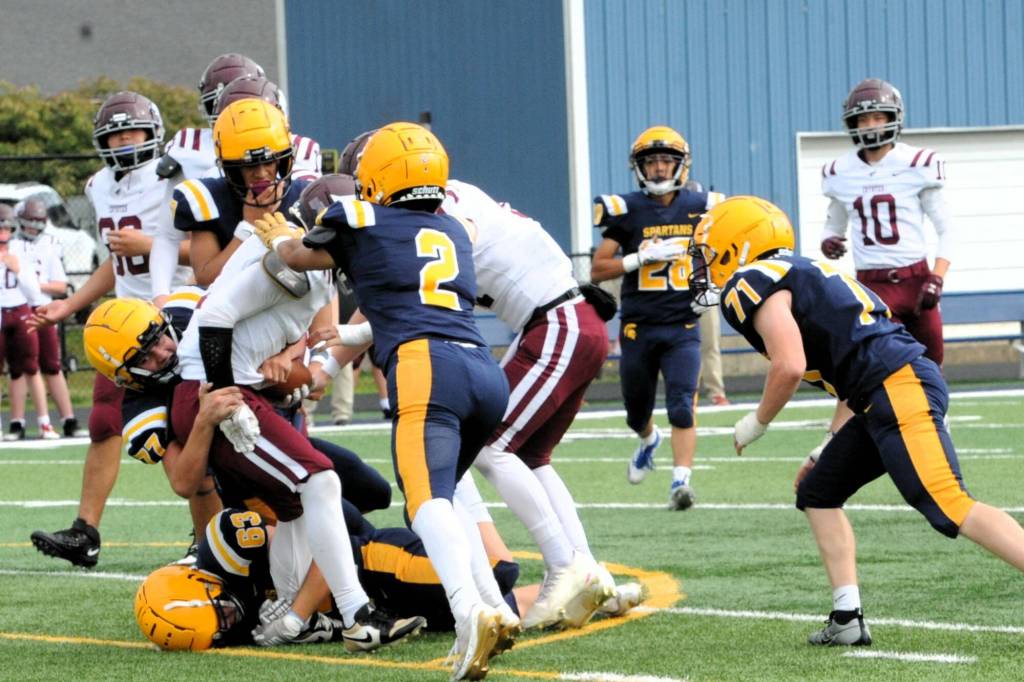 Spartan Brodie Fletcher recovered this Kittitas fumble Saturday afternoon at Spartan Stadium, where the short-handed Spartans were bitten hard by the Kittitas Coyotes 41 to 0. Also in on the action are Spartans Landon Thomas (77) and Kaden Ward (23).