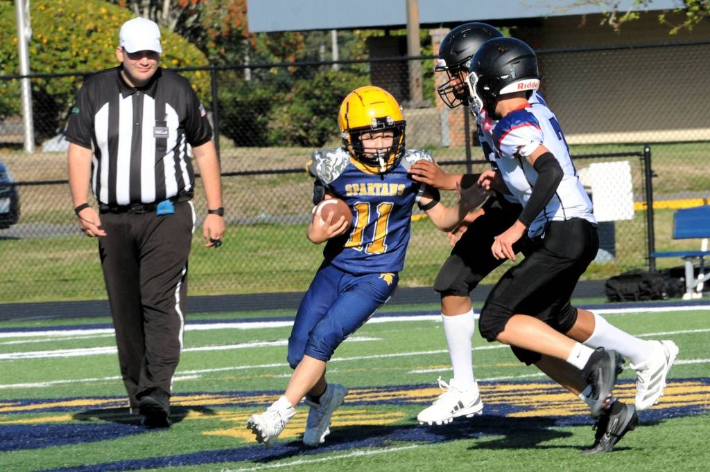 Spartan 8th grader Ryder Romberg (15) picks up good yardage against Blue Heron of Port Townsend, Wednesday, Sept. 24 at Spartan Stadium, where the young Spartans defeated Blue Heron 38 to 0. Also in on the action are teammates Xander Black (11), Lokeni Alefosio (75), and Tommy Sorensen (5). Photo by Lonnie Archibald