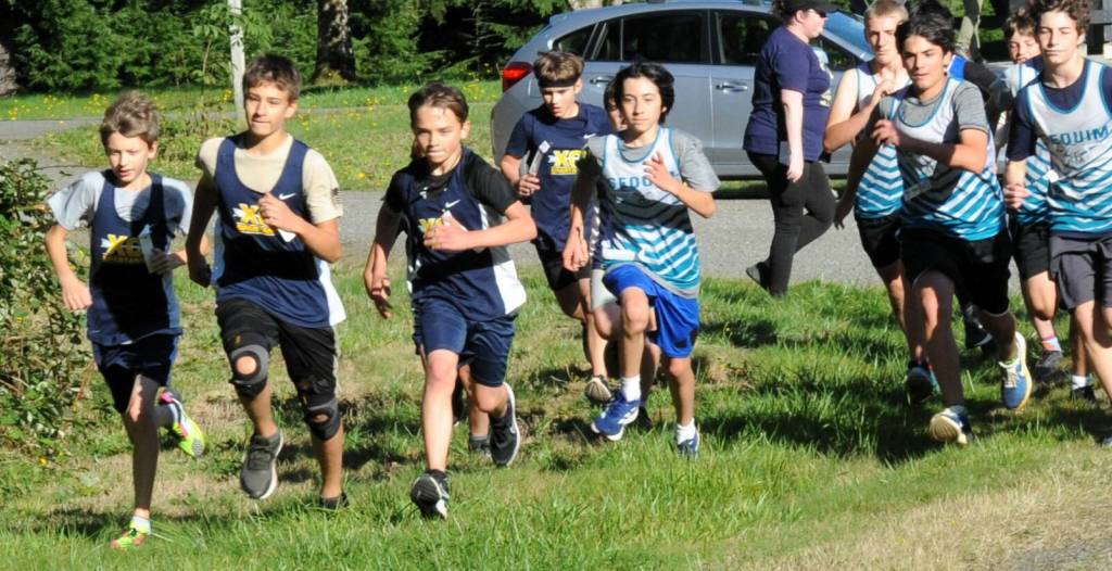 Below, Forks boys (far left) got a good start during the cross country race on Wednesday at the ONRC. Approximately 50 boys competed in this middle school race.