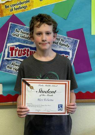 Ms. Streutker, his math teacher, said “Alex is worthy of being the Student of Month as he consistently demonstrates responsibility, respect, and safe behavior. I’ve enjoyed getting to know him this year.. It is wonderful to have a student that is as patient and kind as him. He has high expectations and is self-motivated to do well on all tasks. His contributions to class discussions are helpful and positive. I am lucky to have him as my student.” Alex’s band and music teacher, Mrs. Murillo added “Character traits I admire about Alex Echeita are honesty, integrity, respectfulness, responsibility and that he is very self motivated to succeed and produce quality work.” Alex would like to thank his mom, dad, brother, grandma, teachers, and his friends for supporting him. Way to go, Alex!