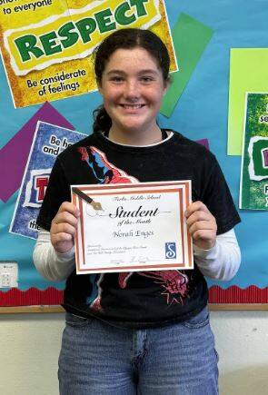 When asked why Norah was chosen to be student of the month, Norah’s social studies teacher, Miss Gingrich, said “Norah is always prepared for class and participates fully in all activities. She is kind and extremely helpful to other students, and goes above and beyond on her assignments.”
