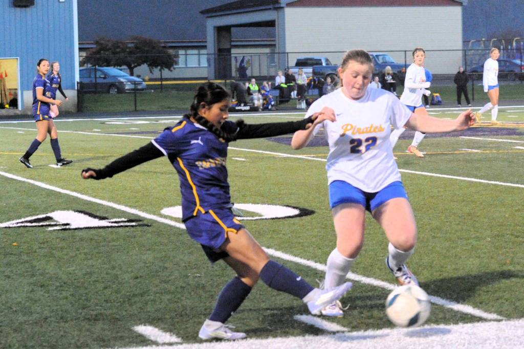 Spartan goalie Pearl Salazar makes the save in front of the net against Adna, of the Chehalis school District, on the surface of Spartan Stadium, where Adna defeated the shorthanded Spartans 6 to 0. Also in the action are Forks’ Joanna Hernandez-Beltran (4), LaRayne Blair (7), and Skye Hestand.