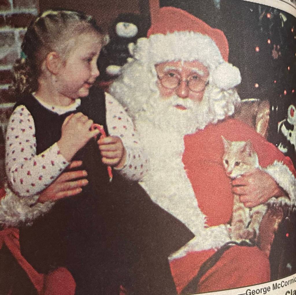 This week in 2000 Mayor Arbeiter had announced that January 8, 2001 would be Susan Owens Day. The Soroptimists’ Festival of Trees had raised $6,100. Dave Robinson had served as the auctioneer (photo). Megan Suslick had brought her cat to see Santa (photo).