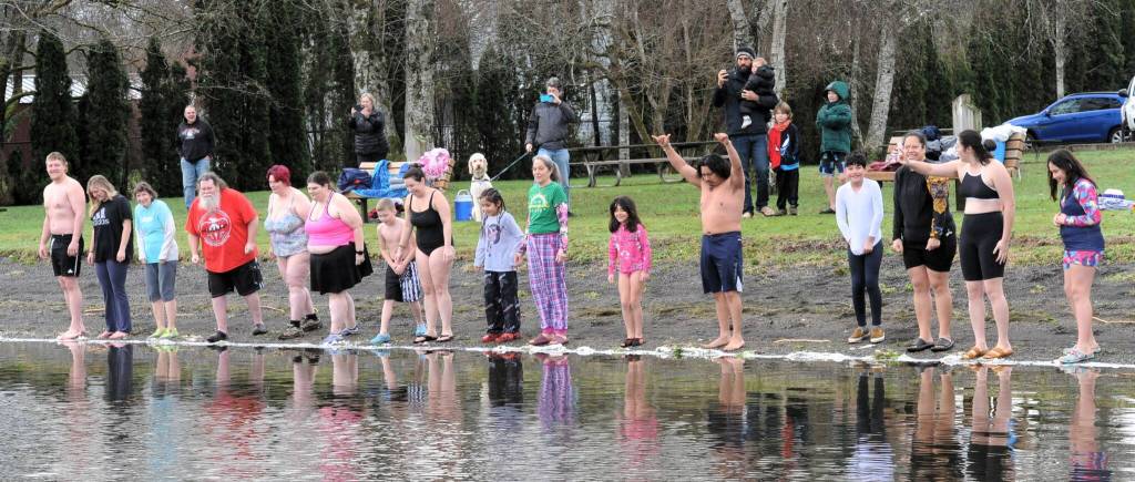 Seventeen brave souls line up on the shores of Lake Pleasant on New Year’s morning, waiting for Carin Hirsch’s ringing of the bell, indicating the start of the annual plunge. Another photo page 3. Photo by Lonnie Archibald