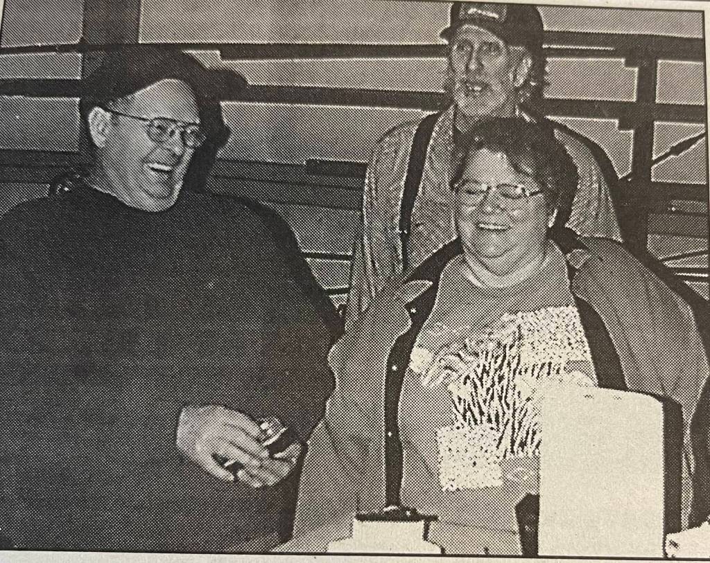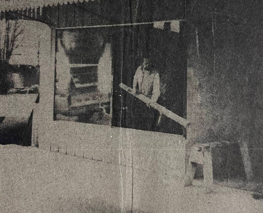 In 1976, the Kinders had purchased the Variety Store, and their photo appeared in the paper (photo). Windows had been broken out of the Hang-up Tavern, and were being replaced by D.D. Peterson; no further information was provided on how they got broken (photo).