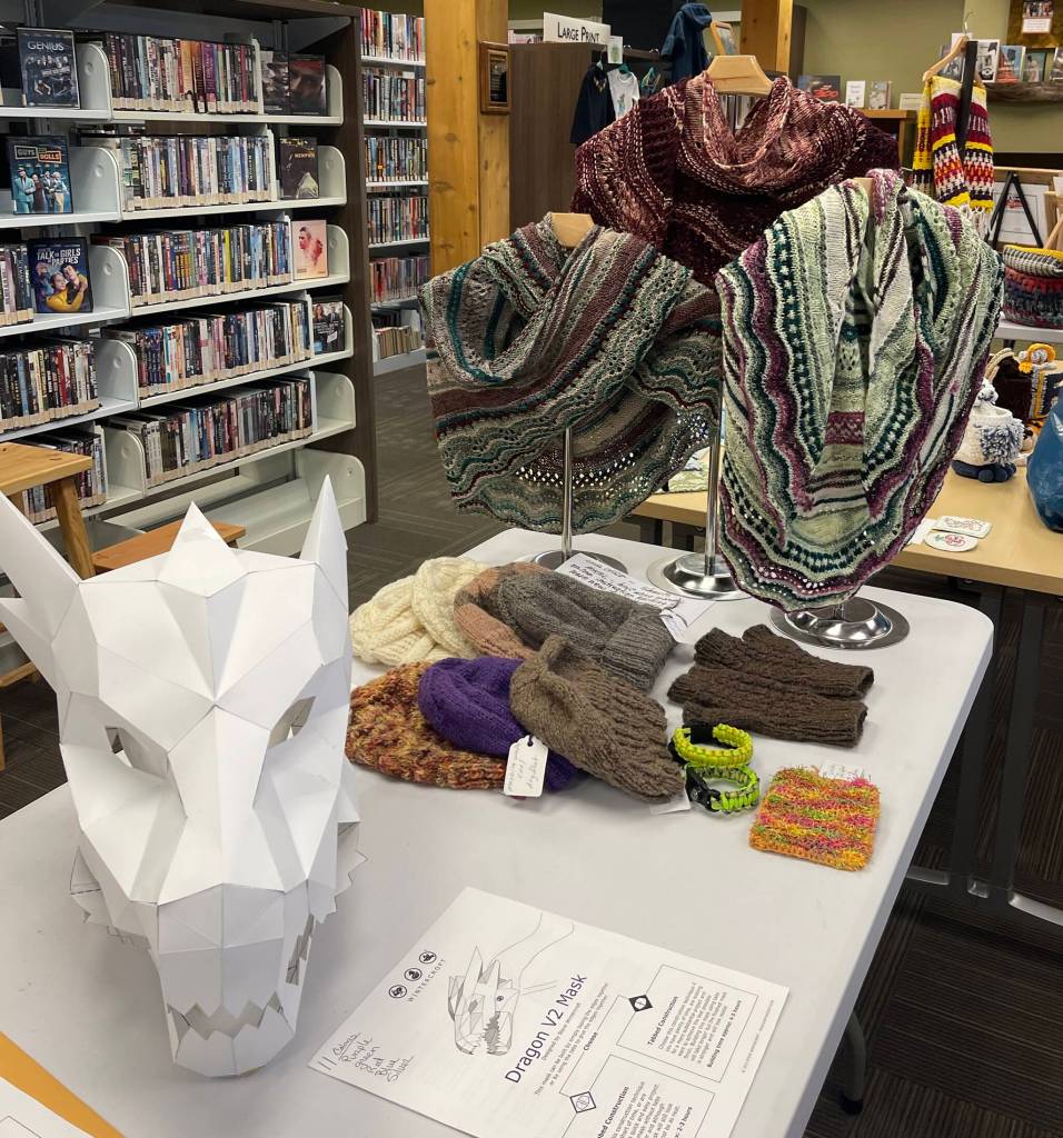 Rainforest Council for the Arts took over the Forks Library on Saturday and local artsists and crafters offered up a variety of things they worked on in the month of January. In addition to the display out front, and fresh off their crane-making fun, the Hunters were set up in the Klahn room at the Library on Saturday helping kids and some adults do some fun crafts.