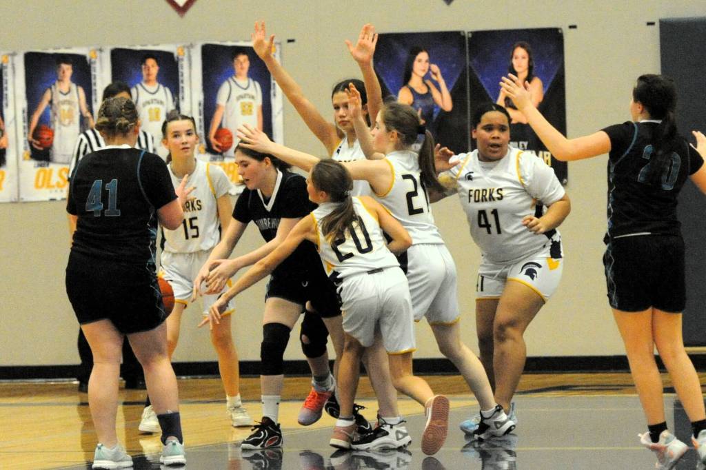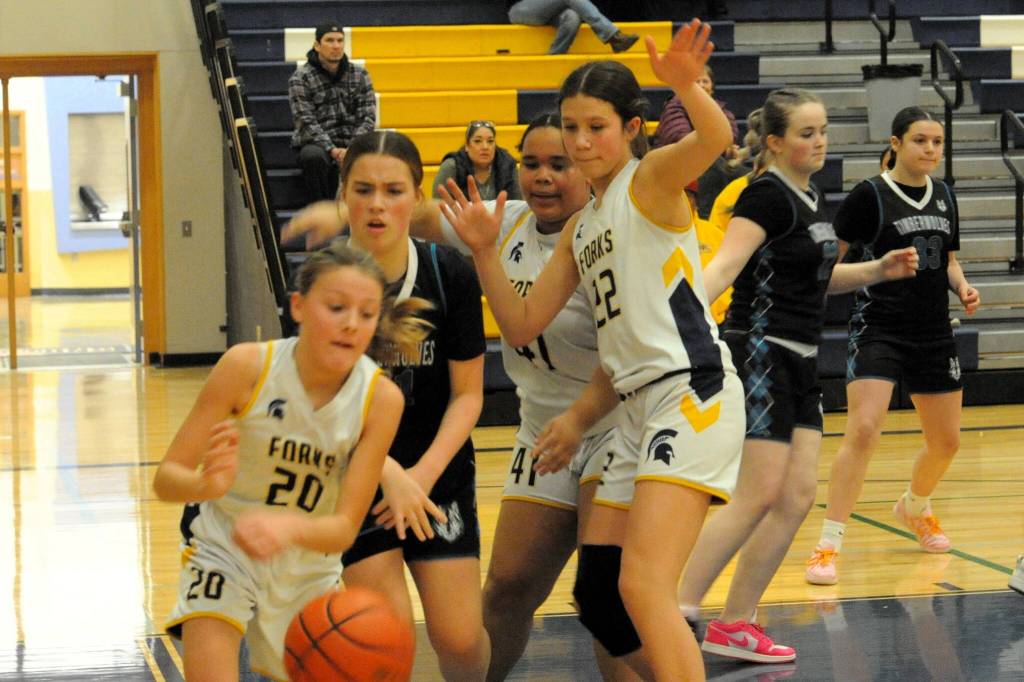 Spartan 7th graders in action against Sequim are Addie Watson (20), Jessellen Ramos (41), and Kinzie Daniels (22). Forks easily defeated Sequim in the Spartan Gym.