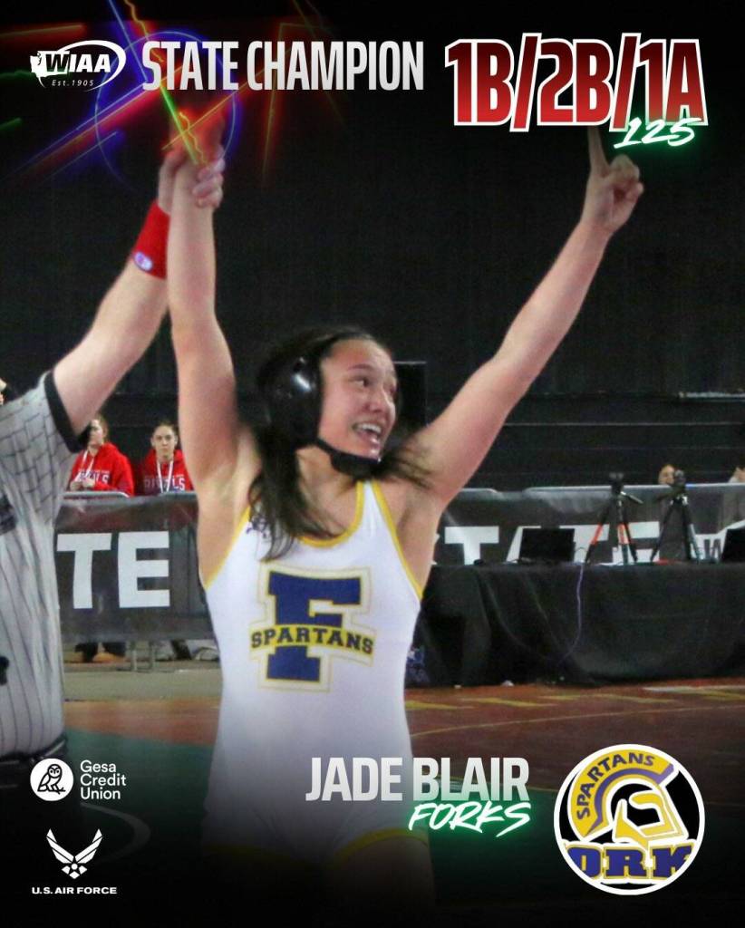 TACOMA — For the first time since 1992, the Forks wrestling programs have two state champions. The Forks boys also for the ninth straight year finished among the top seven teams at state, coming in third as a team at the Mat Classic with a total of eight wrestlers placing, including 285-pound state champion Kenneth Daman. Joining Daman on the championship podium was Forks’ Jade Blair, who won the 125-pound state title at the girls 1B/2B tournament.