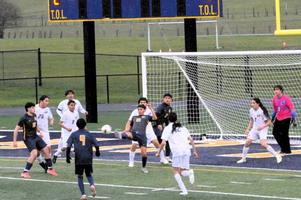 Above: Forks Yosgart Gonzalez Ayala kicks to a teammate who scored against the Warriors in this league contest on the surface of Spartan Stadium. Also in the action are Margarito Gonzalez Black (10), Adan Montealegre (9), and Dani Ornelas.