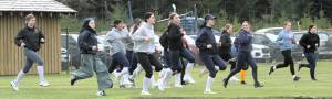 Forks first baseman Radly Bennett makes the play for the out against Montesano at Fred Orr Memorial Park on Monday, March 23. Forks split with Montesano, winning the first game 7 to 2 and losing the second 9 to 4.