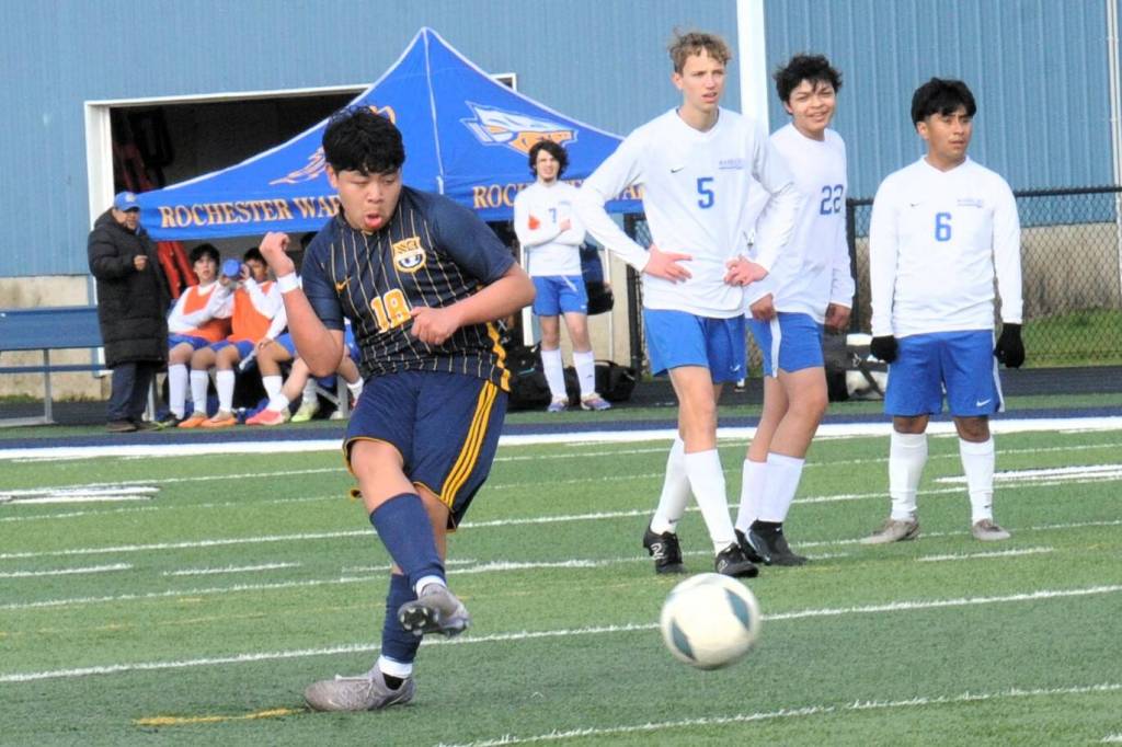 Rochester players were impressed by the speed of the Spartans while Spartan Ismael Hernandez (18) was getting a kick out of soccer. Forks players also got their kicks defeating Rochester 3 to 1 in jv action.