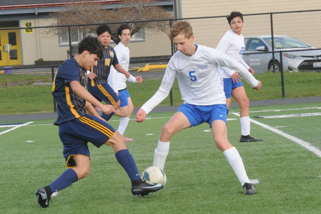 In jv action, Oscar Olivera controls the ball against Rochester March 25 at Spartan Stadium. Also in the action is Ismael Hernandez.