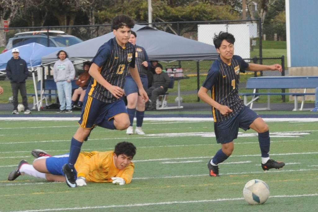 Spartans Oscar Olivera (13) and Bernabe Calmo Cartillo (9) run past the Rochester goalie in route to another Forks goal.