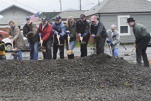 City officials and guest shovel operators break ground for the new Rainforst Arts Center.
