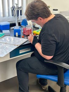 Carter Richards conducts an enzyme-linked immunosorbent assay (ELISA) to test seawater for HAB toxins.