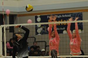 Spartan Kaidence Rigby (13) and Chloe Gaydesk (6) go for the block against Chief Leschi who Forks defeated…