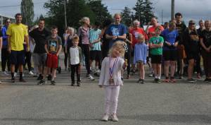 Fun runners get on their marks … as Ellie Romeo, daughter of Tony Romeo, previously of Forks, was the starter as she waved her checkered flag for the beginning of the race. Photo by Lonnie Archibald